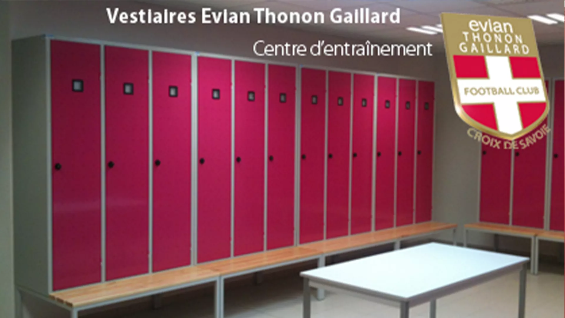 Realization of customized lockers, for French first league soccer team sport center. Quadro line locker on bench with customized doors color RAL 4010. Inside made for sport accessories storing.